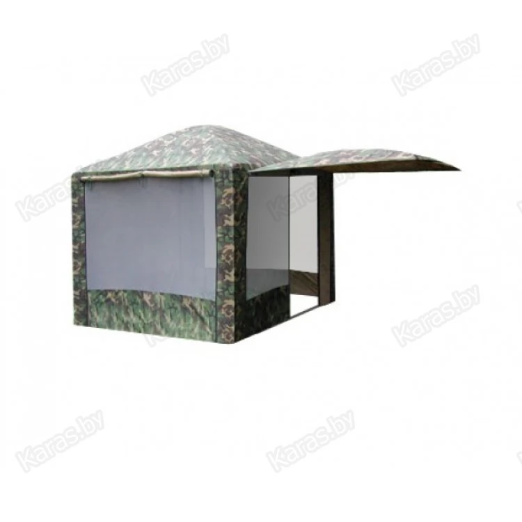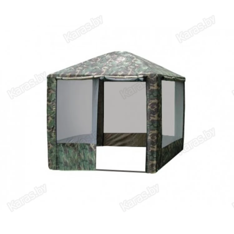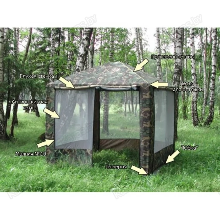 Удобный сборно-разборный шатер-тент с противомоскитными сетками предназначен для защиты от грызунов, насекомых и неблагоприятной погоды, поэтому с успехом используется на отдыхе в природных условиях.Прочный каркас шатра изготовлен из стали, поэтому вся конструкция устойчива к ветру. Все части каркаса надежно фиксируются между собой. Тент сшит из ткани, пропитанной специальным водоотталкивающей пропиткой. (водоотталкивающая пропитка 2000 мм. водного столба). Все швы проклеены.Стропы с пряжками, а также молнии помогают хорошо натянуть тент. При необходимости можно поднять все стенки и зафиксировать. Стальной каркас беседки имеет нижнее основание, все его части надежно крепятся между собой. Крестовины сделаны из утолщенной металлической трубы, что позволяет повысить устойчивость конструкции. Стропы и липучки помогают хорошо натянуть тент.