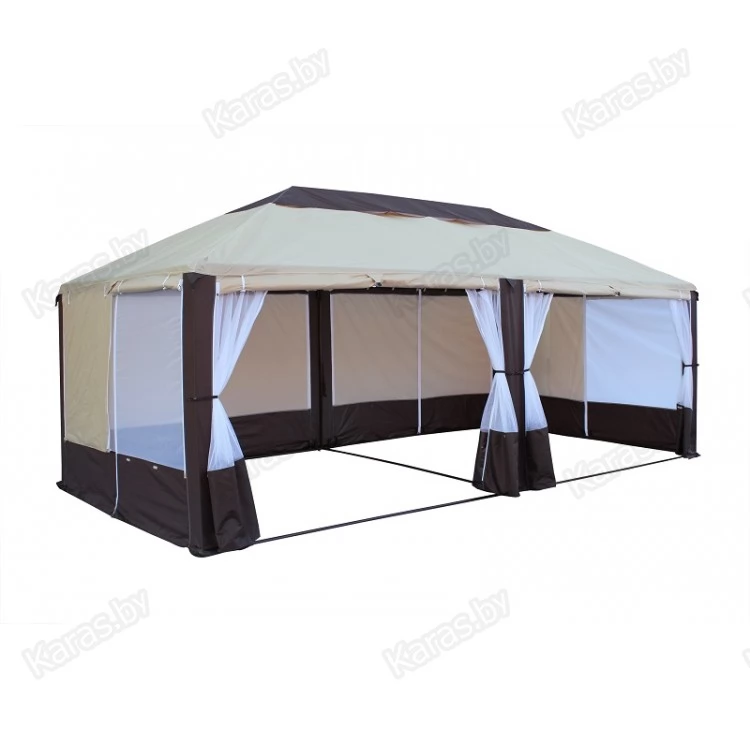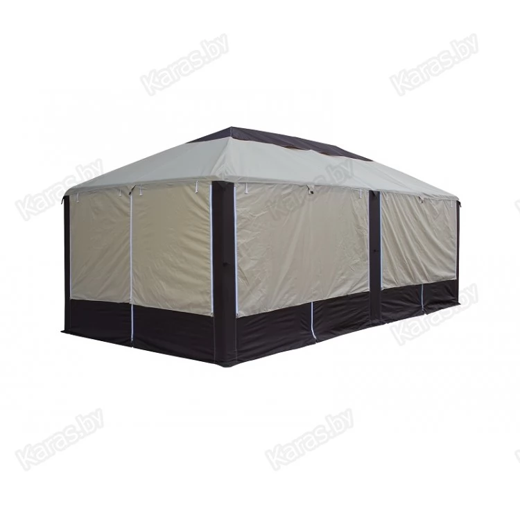 Тент шатра выполнен из полиэфирной ткани oxford 240D PU 2000 с водоотталкивающей пропиткой (водостойкостью 2000 мм водяного столба), устойчивой к воздействию солнечных лучей.