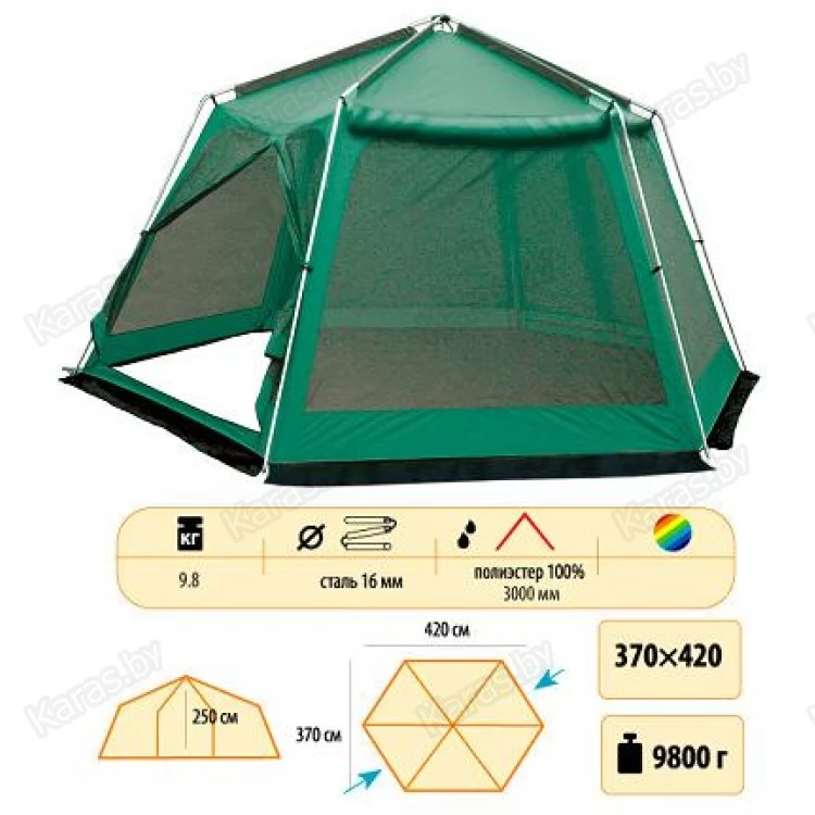 Палатка-шатер с двумя входами идеален для отдыха на открытом воздухе в летнее время, спасает от легкой непогоды, солнца, насекомых. Внешний тент палатки устойчив к ультрофиолетовому излучению и имеет пропитку, задерживающую распространение огня. Тент оборудован юбкой. Противомоскитная сетка и убирающаяся защита от дождя на молнии. Входы продублированы москитной сеткой, закрывающейся тканью на молнии. Разработано и произведено в полном соответствии с ГОСТ 28917-91 и ISO 5912-85. Официальная гарантия 1 год.