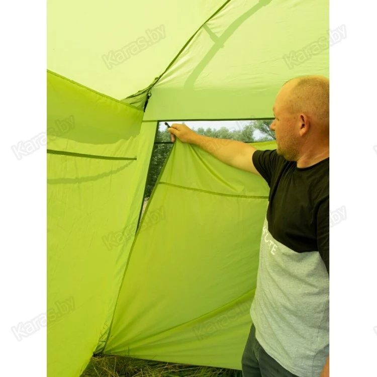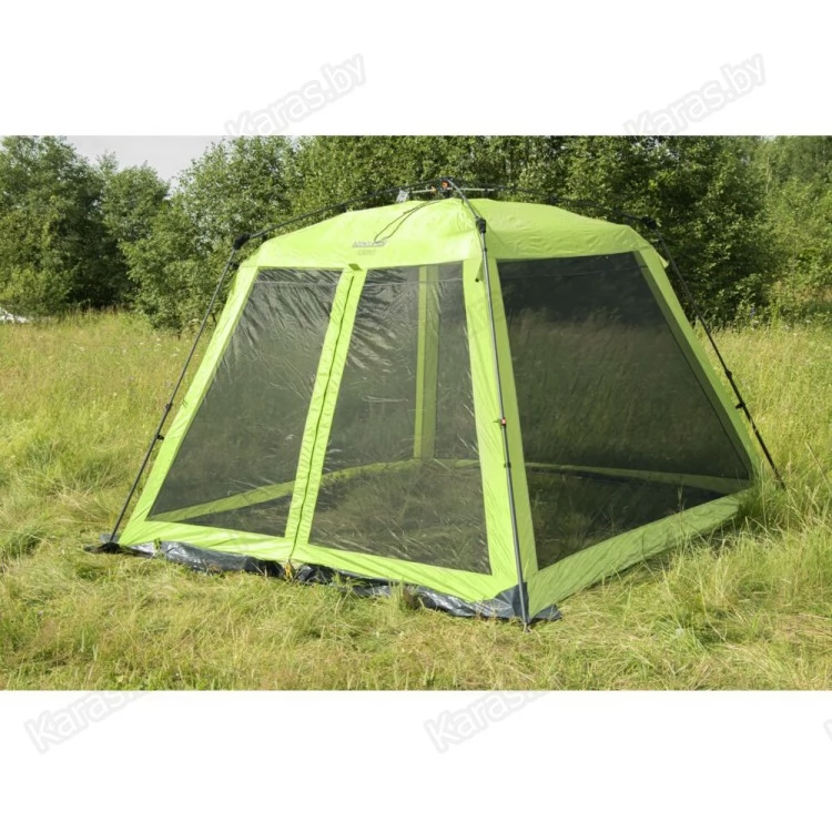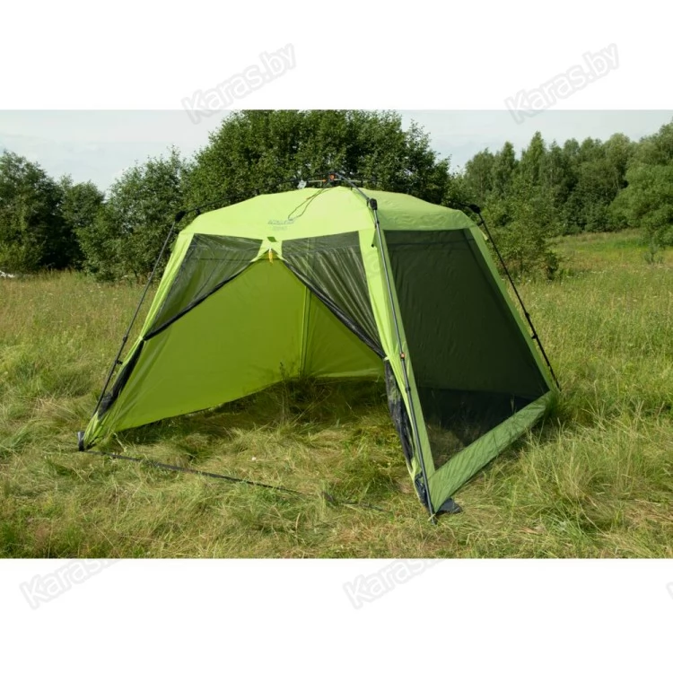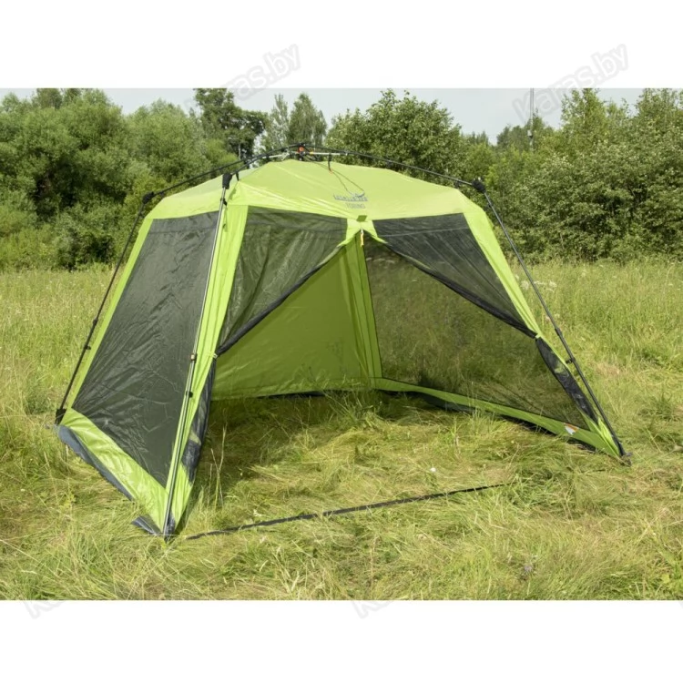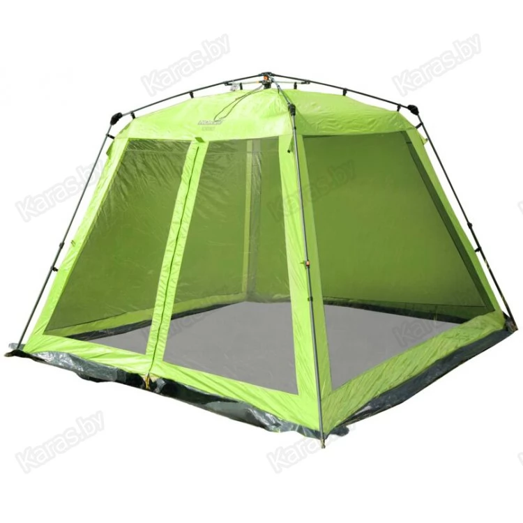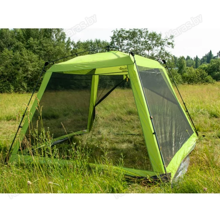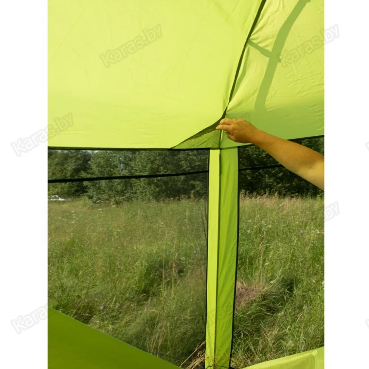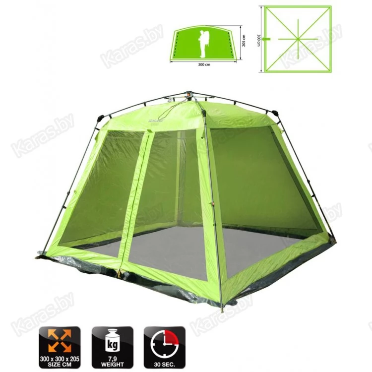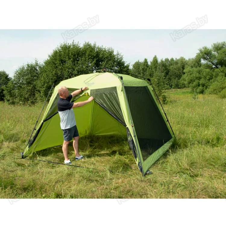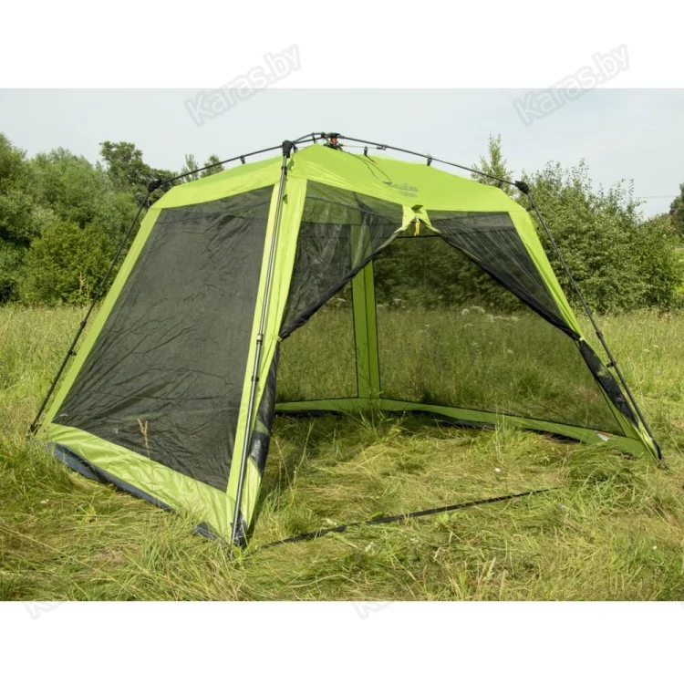 Летний тент-шатер с полуавтоматическим быстросборным каркасом и стальными телескопическими боковыми стойками. Легко устанавливается одним человеком за считанные секунды. Высокий и вместительный. Вход и все стенки из антимоскитной сетки.