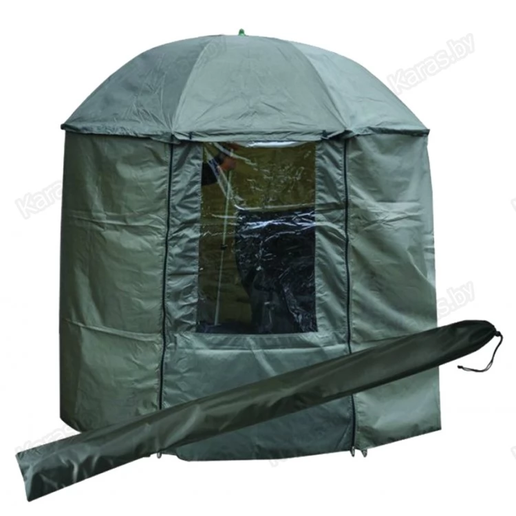 Рыболовная палатка-зонт с пологом, которую можно использовать и для хозяйственных нужд. Созданная специально для рыбалки, она отлично защищает от ветра и непогоды, прочно крепится к земле стальными колышками, оборудована по периметру широкой ветрозащитной юбкой. Дверь с усиленными молниями и обзорное окно, которое можно использовать для вентиляции. Из приятных мелочей - большие карманы внутри палатки.