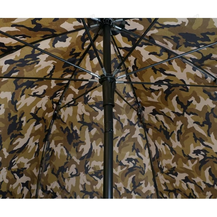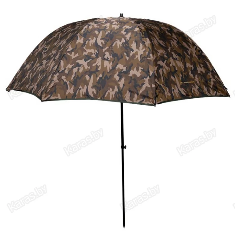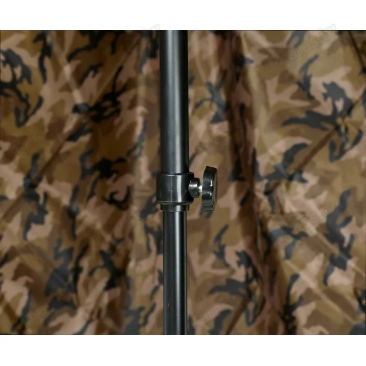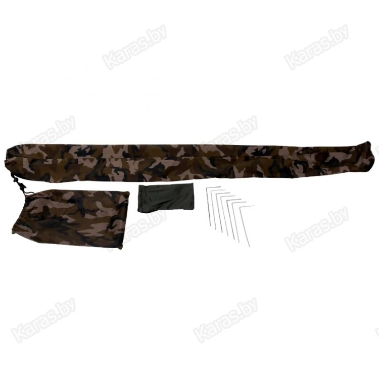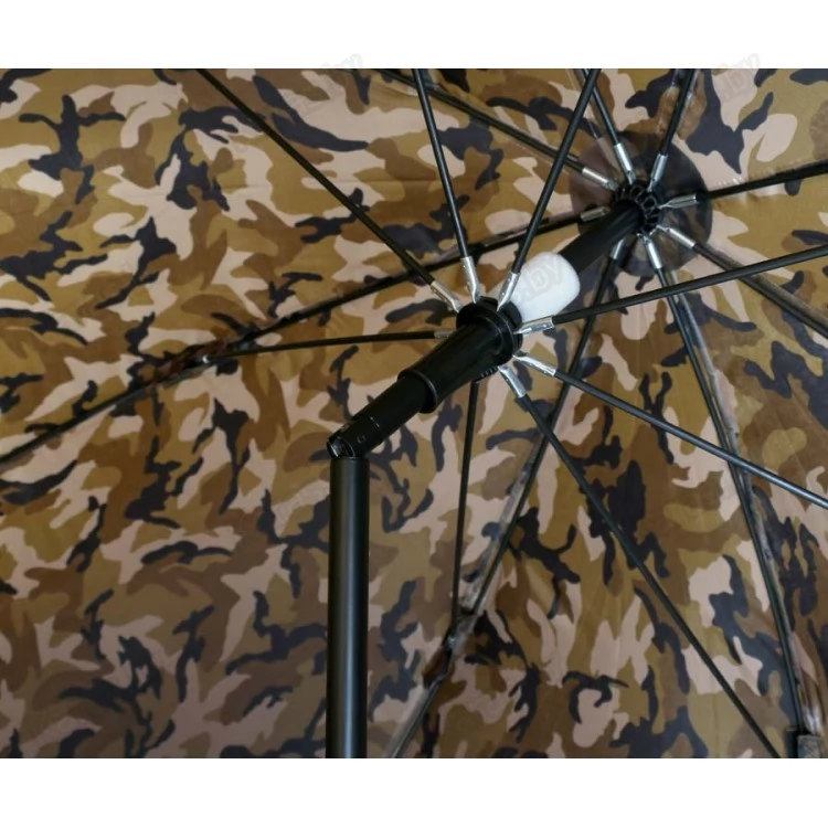 Качественный рыболовный зонт с тентом. Обеспечит надежную защиту от ветра и дождя. Купол диаметром 2,5 м и широкий тент выполнены из легкого и прочного нейлона. Купол зонта можно установить под наклоном (для этого на стойке имеется угловой шарнир с фиксацией). Тент крепится к куполу посредством молнии. Материал тента пропускает воздух, обеспечивая при этом влагозащиту. Металлические элементы каркаса способны выдержать значительные нагрузки, возникающие, например, при порывах ветра. Для большей устойчивости тент крепится к земле металлическими колышками Г-образной формы — они входят в комплект и поставляются со шнуром в отдельном чехле.В сложенном виде зонт обладает небольшим объемом и весом. Цвет зонта — камуфляж. Вес — 2,7 кг.