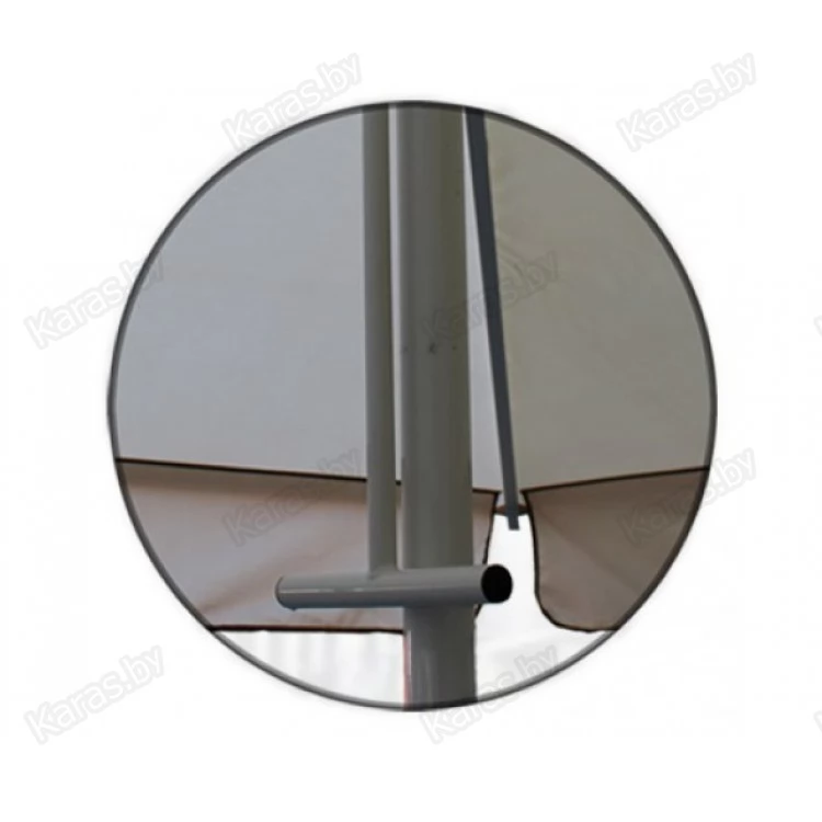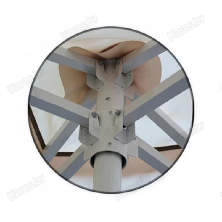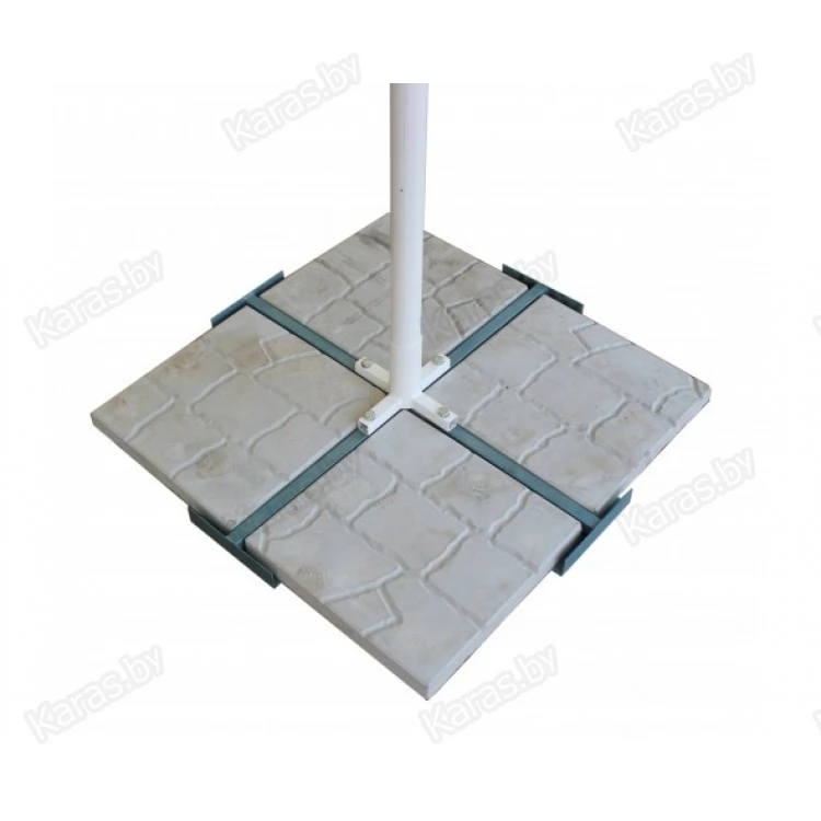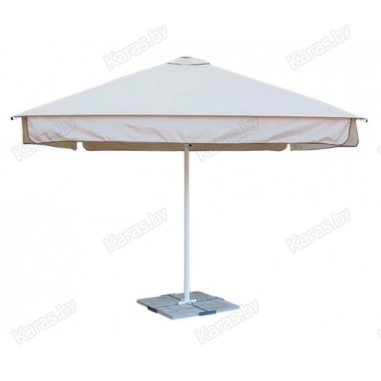 Зонт с центральной стойкой, квадратный 3,0х3,0 (4 спицы) На торцах всех деталей установлены пластиковые декоративные заглушки. Зонт устанавливается на стальную подставку рассчитанную на четыре бетонные плиты размером 40х40 . Процесс разложения зонта осуществляется при помощи подъемной ручки. В конструкции зонта используются только стальные элементы: центральная стойка (труба) диаметром 50 мм, спицы из профиля 25х25 мм, звездочки и узловые соединения.