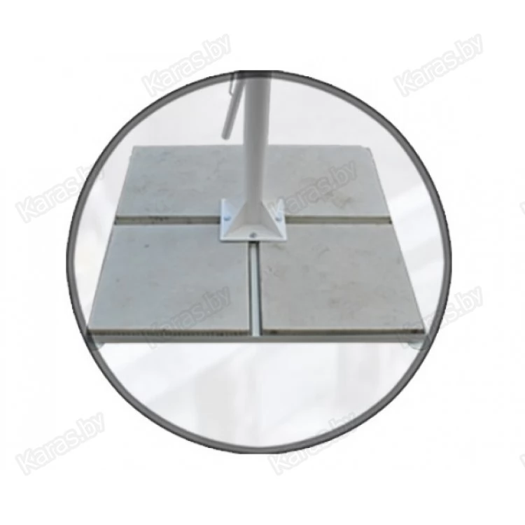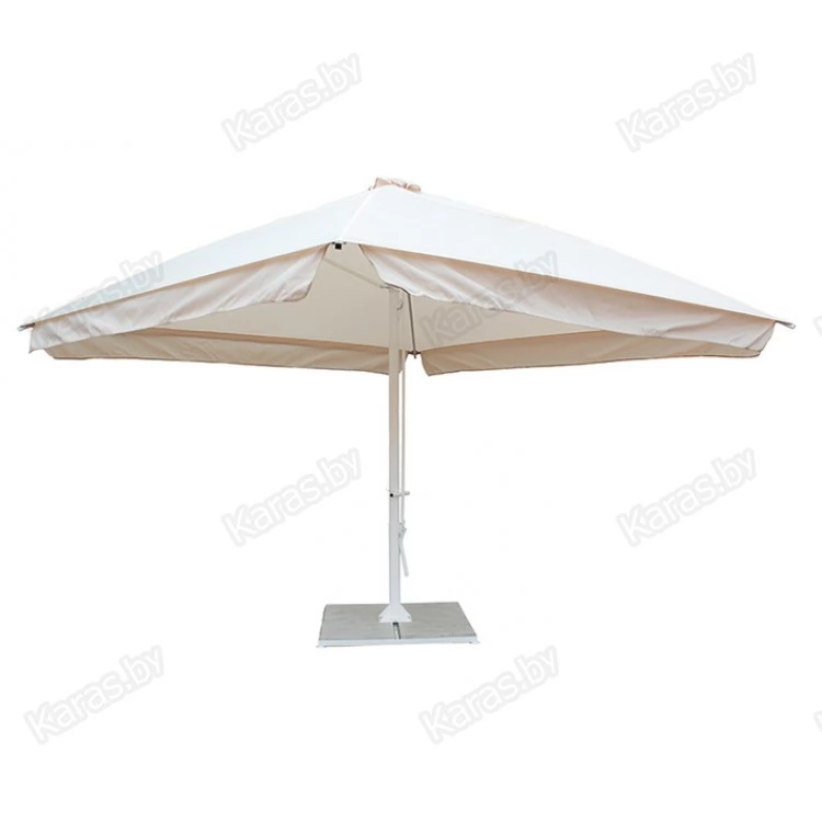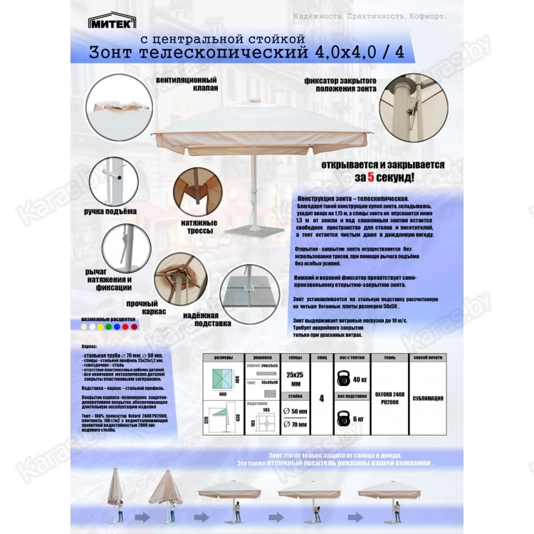 Зонт телескопический с центральной стойкой, квадратный 4,0 х 4,0 ( 4 спицы ) Конструкция зонта – телескопическая. Благодаря такой конструкции купол зонта, складываясь, уходит вверх на 1,15м, а спицы зонта не опускаются ниже 1,3м от земли и под сложенным зонтом остается свободное пространство для столов и посетителей, а тент остается чистым даже в дождливую погоду. Открытие - закрытие зонта осуществляется без использования тросов, при помощи рычага подъёма, без особых усилий. Нижний и верхний фиксатор препятствует самопроизвольному открытию-закрытию зонта. Зонт устанавливается на стальную подставку рассчитанную на четыре бетонные плиты размером 50х50 (плиты в комплект не входят). Зонт выдерживает сильные ветровые нагрузки до 5 м/с.