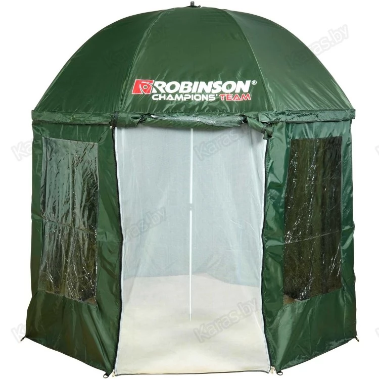 Robinson 92-PA-016 - рыболовный зонт с тентом 360° и антимоскитной сеткой на молнии от известной польской компании. Вход на молниях + окно из прозрачного пластика. Купол зонта можно установить под наклоном (для этого на стойке имеется угловой шарнир с фиксацией). Тент крепится к куполу посредством молнии. Материал тента пропускает воздух, обеспечивая при этом полную влагозащиту. Каркас зонта способен выдержать значительные нагрузки, возникающие, например, при порывах ветра. Для большей устойчивости тент крепится к земле металлическими колышками Г-образной формы — они входят в комплект и поставляются с растяжками в отдельном чехле. Все швы проклеены. В сложенном виде зонт обладает небольшим объемом и весом. Может использоваться в качестве защиты от дождя и солнца на рыбалке, либо во время отдыха на природе.