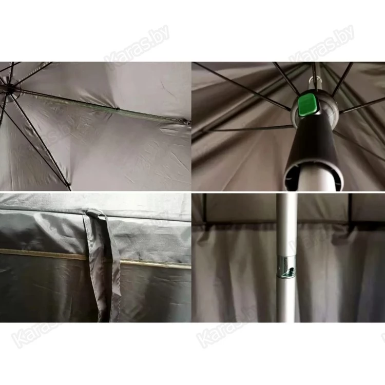 Зонт рыболовный диаметром 250 см, изготовлен из прочного армированного нейлона. Имеет механизм, который позволяет наклонить зонт под углом до 45 градусов.
