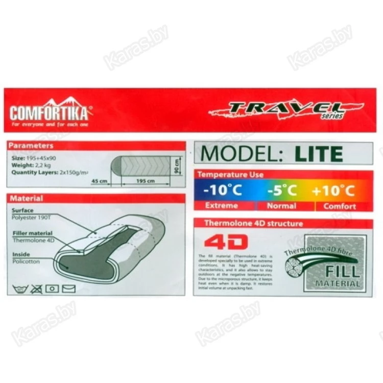 Увеличенный размер спальника позволяет сделать из него одеяло размером 195x180 см. Материал наполнителя (Thermolone 4D) разработан специально для эксплуатации в экстремальных условиях. Имеет повышенные теплосберегающие характеристики и позволяет находиться на открытом воздухе при отрицательных температурах. Благодаря своей микропористой структуре удерживает тепло даже в сыром состоянии. Быстро восстанавливает свой первоначальный объём при распаковке. Спальник оборудован внутренним карманом и капюшоном. Комплектуется компрессионным мешком.