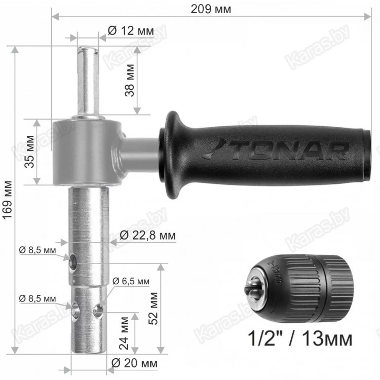 - Посадочный диаметр патрона шуруповерта: 1/2 дюйма (максимальный диаметр зажима - 13 мм).