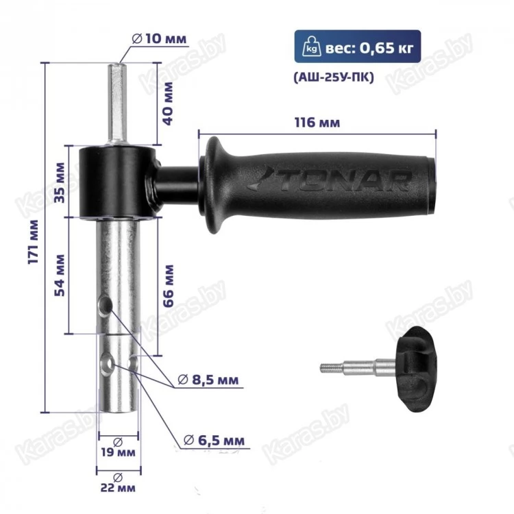 2. винт-барашек с резьбой М6 (отверстие 6,5 мм) для присоединения к ледобурам ТОРНАДО-М2, BURAN и к удлинителю УА-400 для ледобуров ТОНАР и Helios.