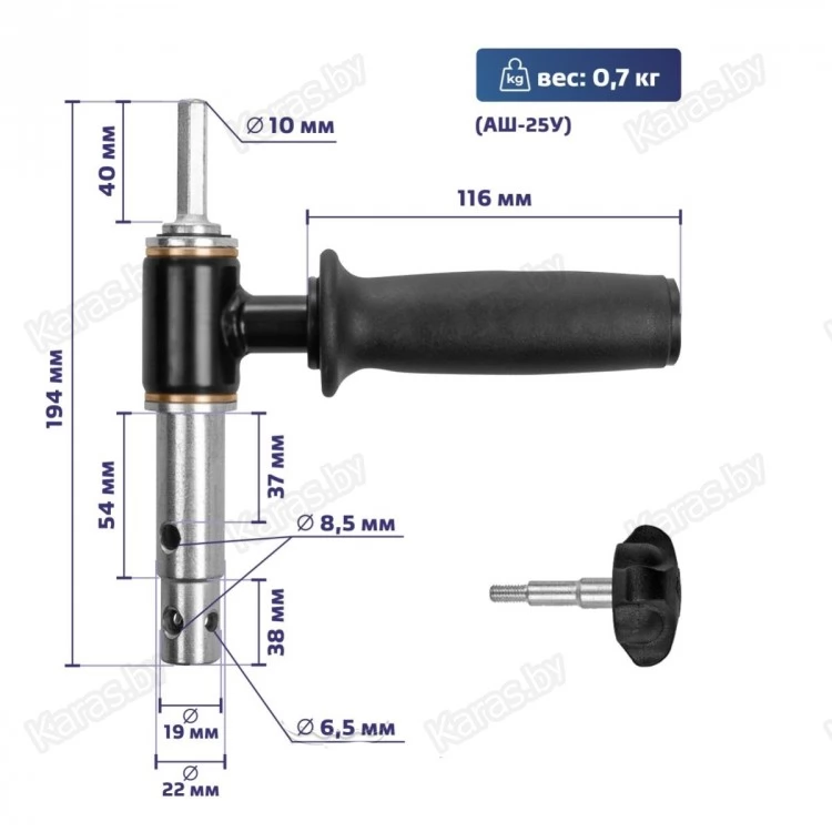 2. винт-барашек с резьбой М6 (отверстие 6,5 мм) для присоединения к ледобурам ТОРНАДО-М2, BURAN и к удлинителю УА-400 для ледобуров ТОНАР и Helios.