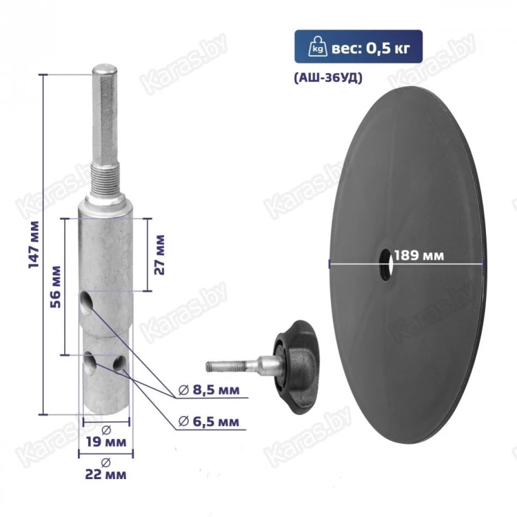 2. винт-барашек с резьбой М6 (отверстие 6,5 мм) для присоединения к ледобурам ТОРНАДО-М2, BURAN и к удлинителю УА-400 для ледобуров ТОНАР и Helios;