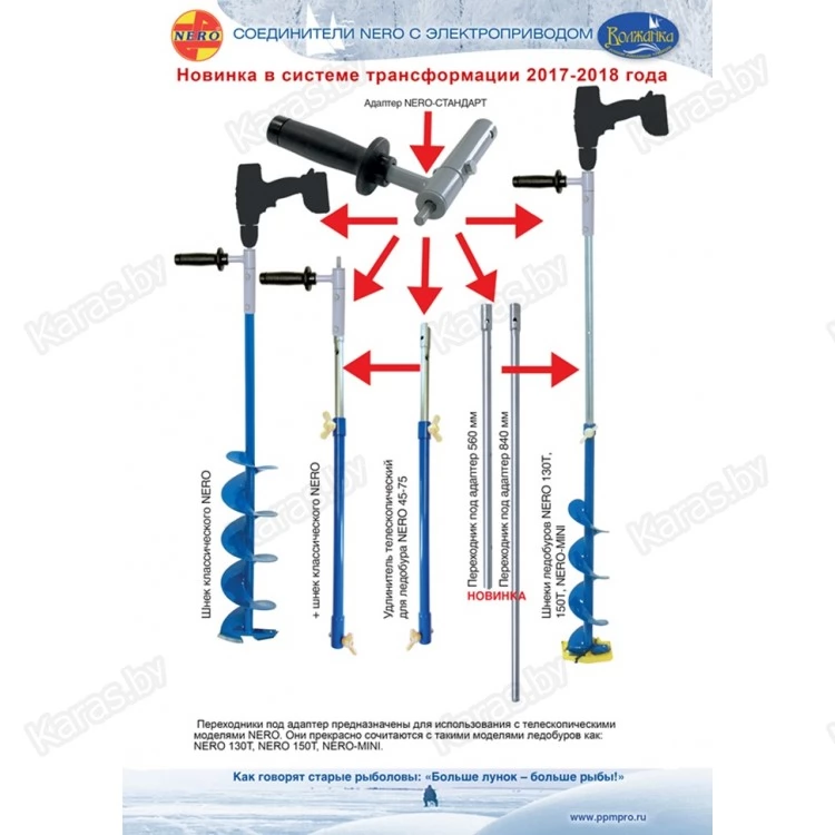 Удлинитель телескопический NERO 4575УТ для ледобура - телескопическая проставка-удлинитель для ледобуров Неро (Nero). Установленный между петлей и шнековой секцией он позволяет пройти лунку во льду толщиной до 1,8 метра, а если лед ещё мощнее, монтаж ещё одной проставки удлинит рабочую часть до 2,5 метров.