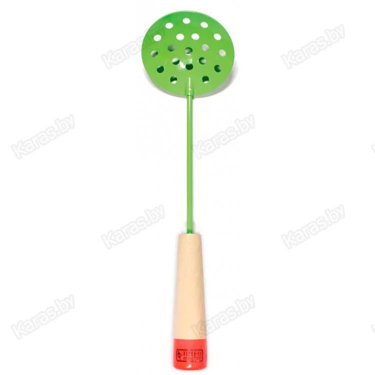 - Ручка изготовлена из твёрдых пород дерева в виде обратного конуса, что предотвращает выскальзывание из руки. Покрыта водозащитным лаком и яркой краской, что снижает вероятность потерять черпак в снегу