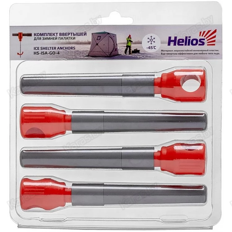 Комплект буров-ввертышей Helios для крепления зимней палатки ко льду (4 штуки). Бур-ввертыш выполнен из высококачественной стали, после закалки имеет высокую твердость - 45 HRC. Материал корпуса выполнен из морозостойкого инженерного пластика, что позволяет эксплуатировать ввертыши в суровых зимних условиях.