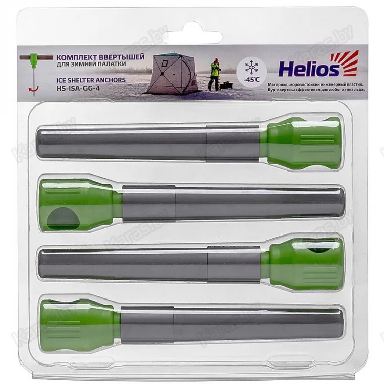 Комплект буров-ввертышей Helios для крепления зимней палатки ко льду (4 штуки). Бур-ввертыш выполнен из высококачественной стали, после закалки имеет высокую твердость - 45 HRC. Материал корпуса выполнен из морозостойкого инженерного пластика, что позволяет эксплуатировать ввертыши в суровых зимних условиях.