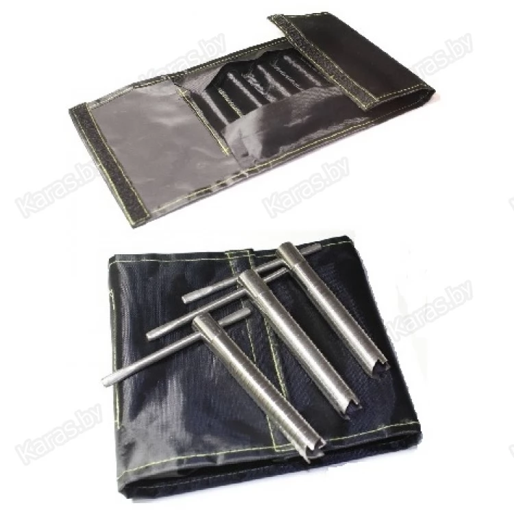 Чехол для хранения ввертышей. Ввертыши используются для крепления зимних палаток на льду. Чехол изготовлен из прочной ткани по принципу портмоне на липучке, имеет 5 отсеков для ввертышей, надежно защищает от острых краев ввертышей.