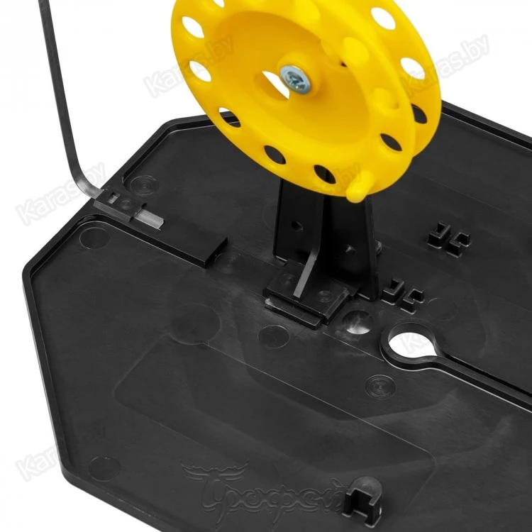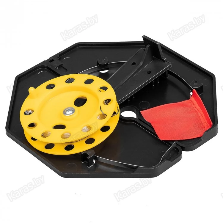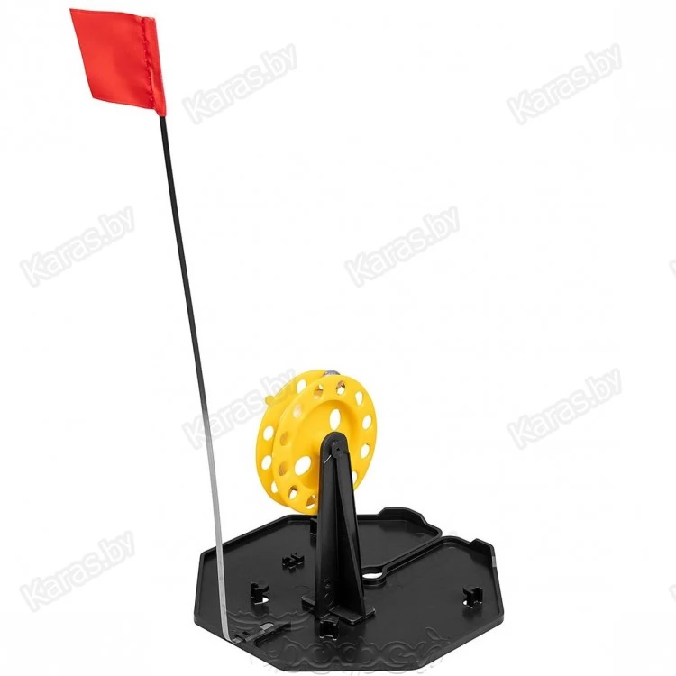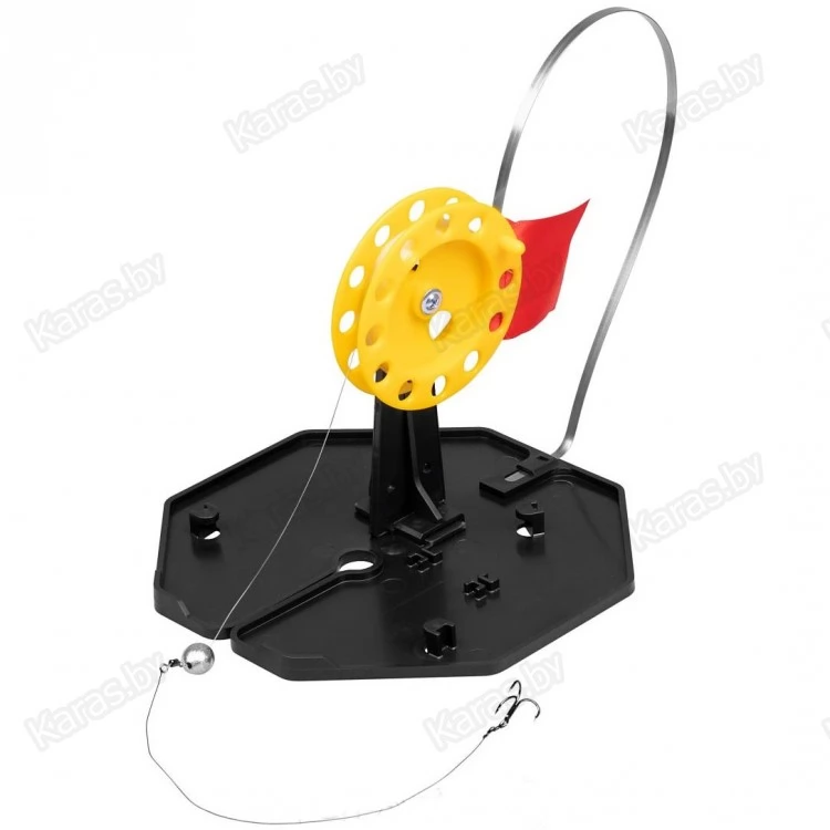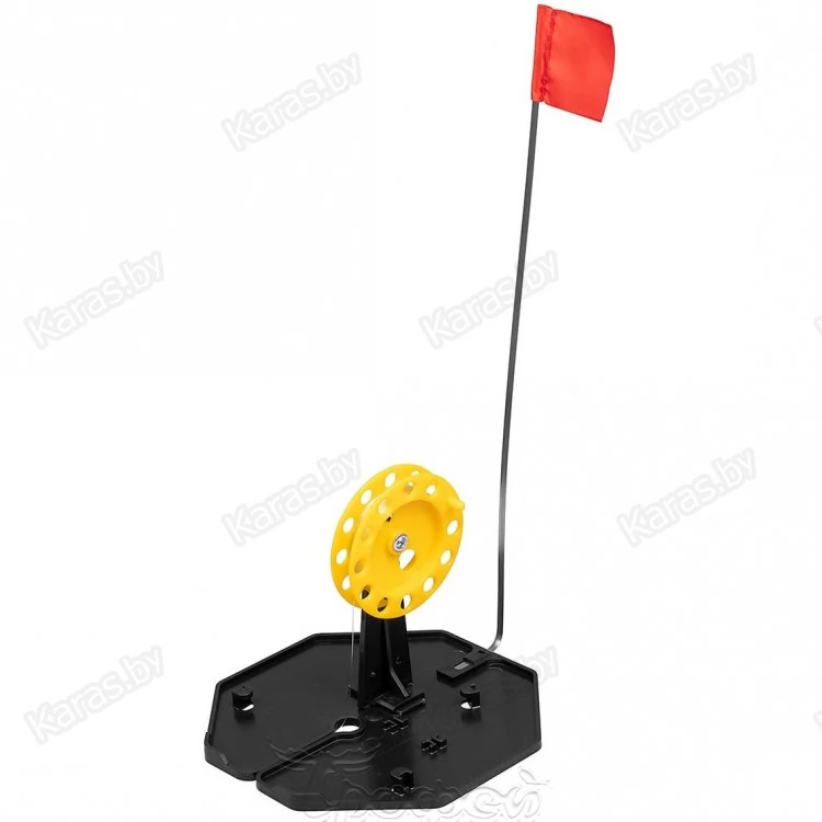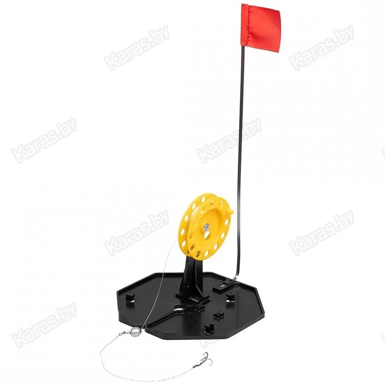 Жерлица зимняя для подледной ловли рыбы состоит из основания, стойки с катушкой и флажка-сигнализатора. Большое и прочное основание жерлицы из морозостойкого полипропилена гарантирует затемнение и защиту лунки от замерзания. Основание выполнено в виде восьмиугольника, что предотвращает проворачивание жерлицы в снегу. На основании находятся: прорезь для завода лески, паз под крепление стойки с катушкой, паз под крепление сигнализатора — флага.