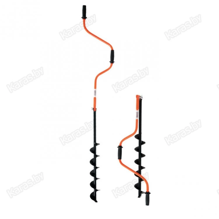 Двуручный ледобур российского производства. Шнековые модели ледобуров диаметром 100-130-150 мм. Отличие двуручных ледобуров от классических заключается в том, что верхняя рукоятка ледобура смещена относительно оси ледобура на 130 мм, а нижняя на 150 мм. Такое расположение рукояток позволяет вращать ледобур одновременно двумя руками, тем самым, увеличивая скорость бурения лунок. Толщина бурения до 1 метра. Вес - 2,1 кг. Оптимальные углы резания, использование для изготовления ножей высокопрочной стали и качественная заточка ножей обеспечивают быстрое бурение при минимальных физических нагрузках. При транспортировке ножи предохраняет специальный пластмассовый чехол. Возможна повторная заточка ножей. Красочное прочное покрытие.