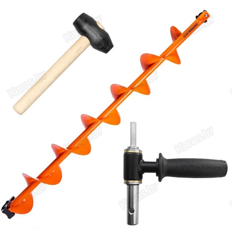 Комплект под мотобур состоит из шнека MOTOSHTORM 150R с правым вращением, адаптера АШ-02 и прорезиненного молоточка.