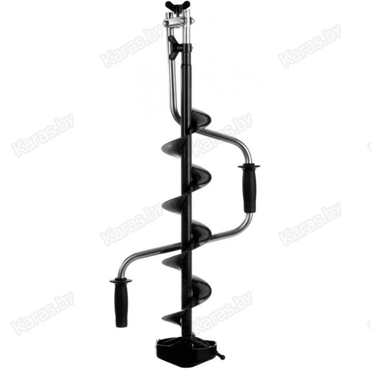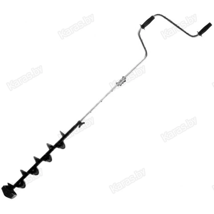 - Удобство использования и транспортировки. Выдвижная телескопическая ручка с тремя фиксируемыми положениями поможет настроить инструмент под свой индивидуальный рост, а в сложенном состоянии длина ледобура не превышает 85 сантиметров.