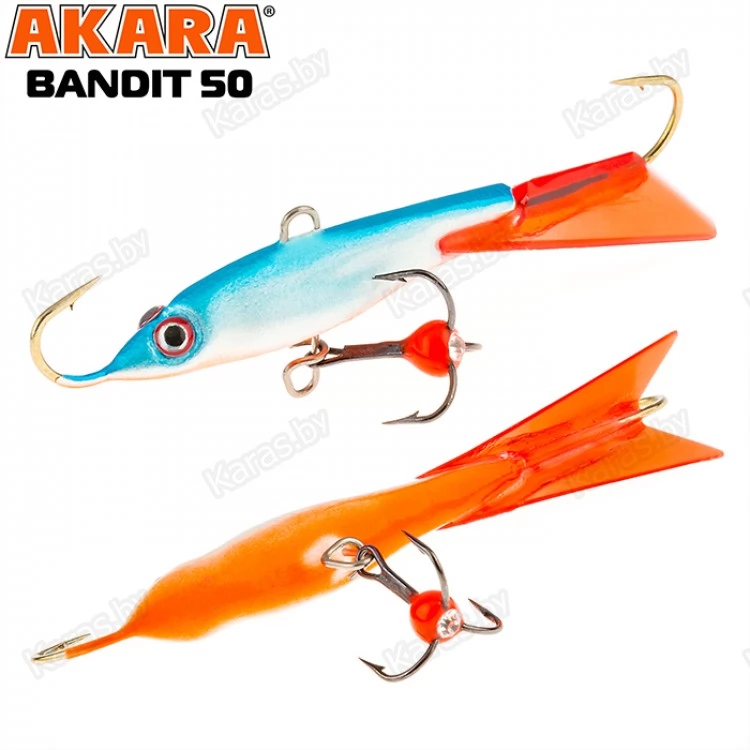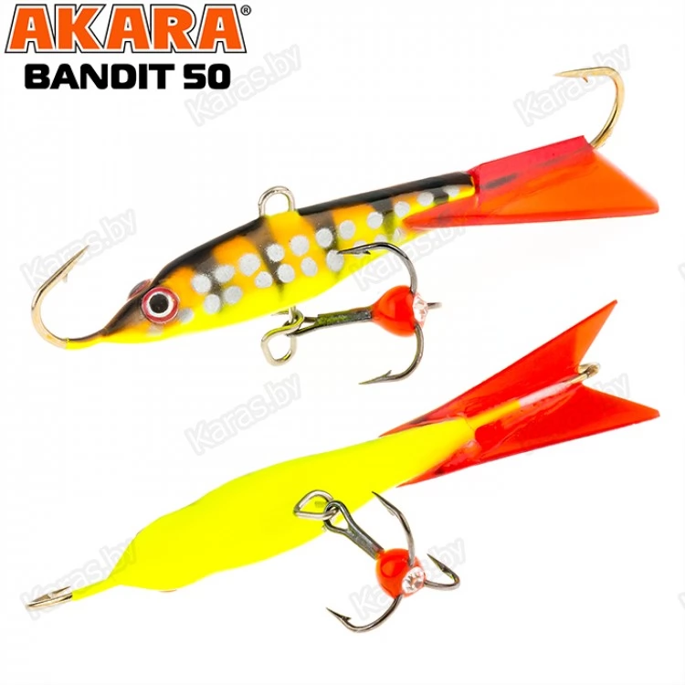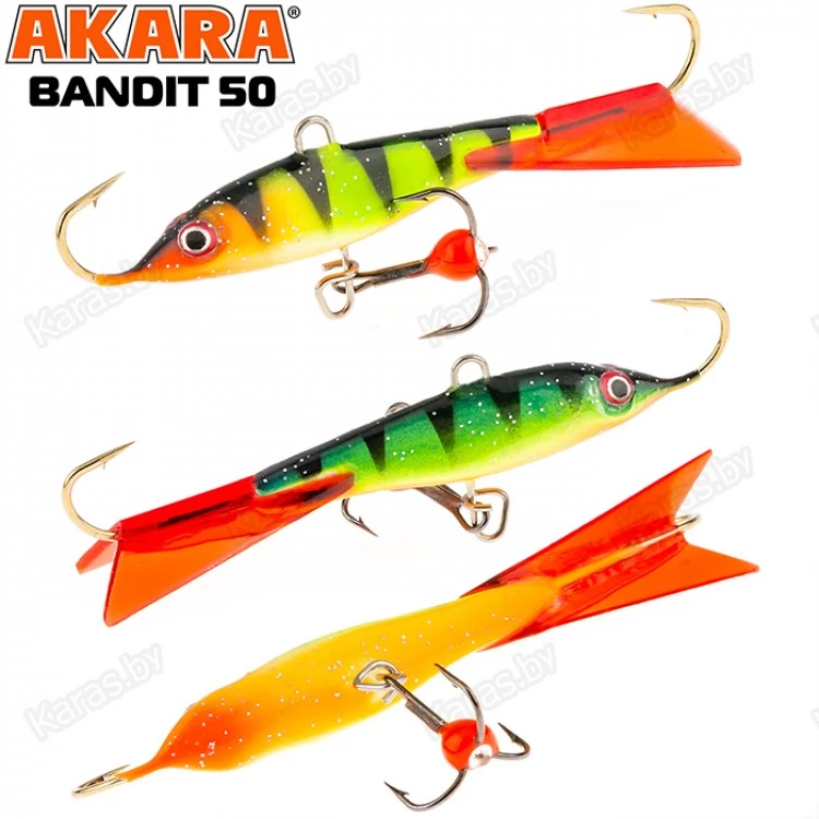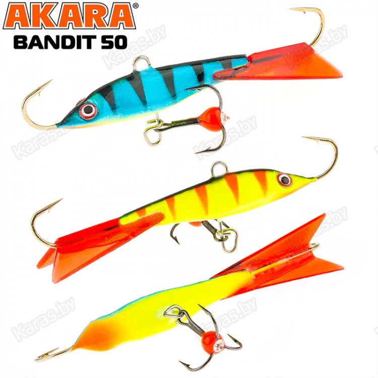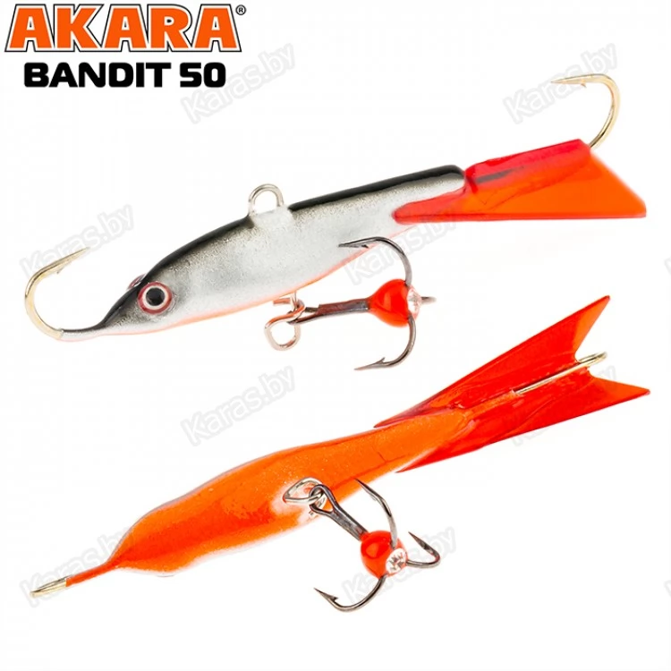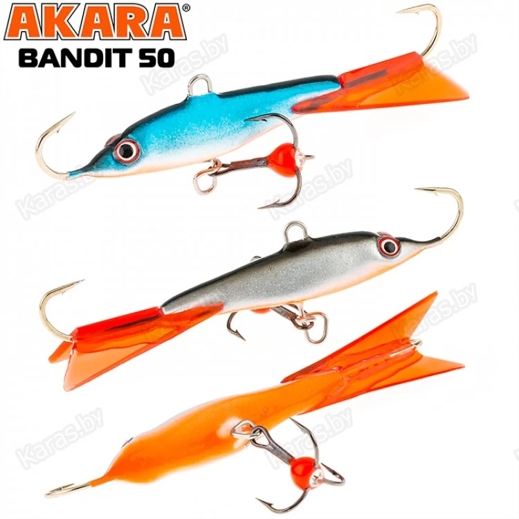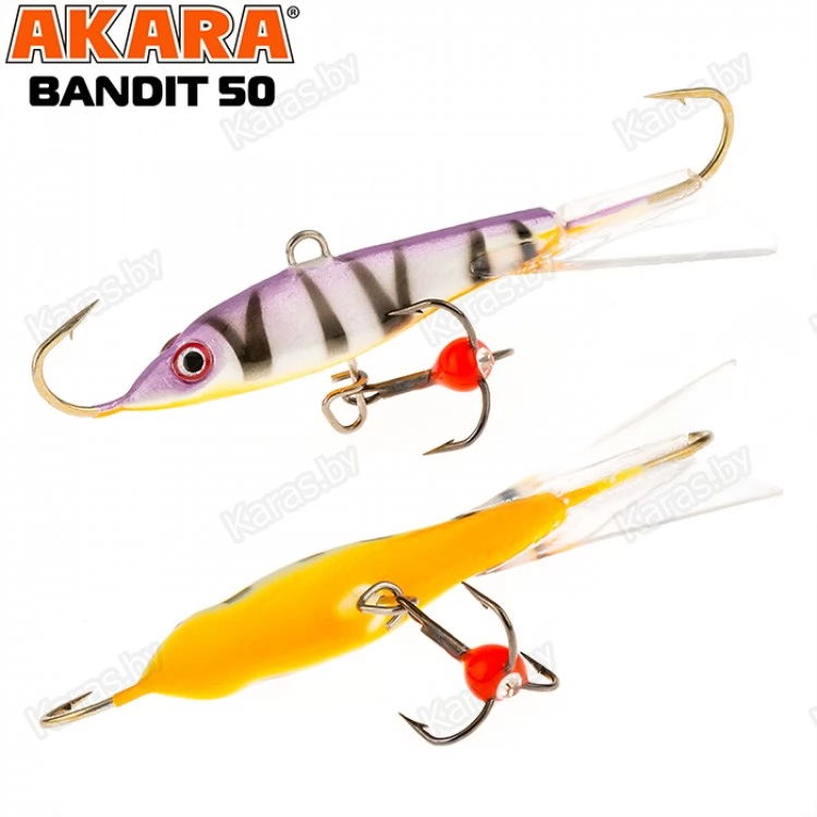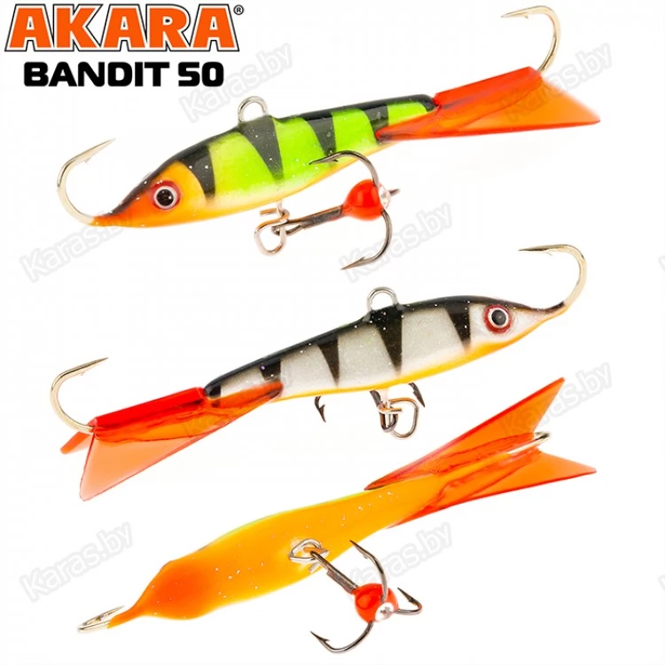Балансир Akara Bandit 50 - разработан для зимней рыбалки, является популярной и эффективной приманкой для ловли окуня. Балансир изготовлен из качественных, морозостойких материалов и оснащен высокопрочными крючками и тройниками японской компании Maruto. Длинна балансира 50 миллиметров, вес – 8 грамм. Балансиры этой модели красятся в уловистые цвета, причем окрашивание осуществляется с применением флуоресцентных UV красок (светятся в ультрафиолетовом диапазоне), либо с использованием люминесцентных фосфорных красок (светятся в темноте). Существуют также варианты двухсторонней окраски. Балансир имеет акцентированную, стабильную и предсказуемую игру, легко отзывается на анимацию и прекрасно подойдет не только опытным любителям зимней рыбалки, но и начинающим рыболовам.