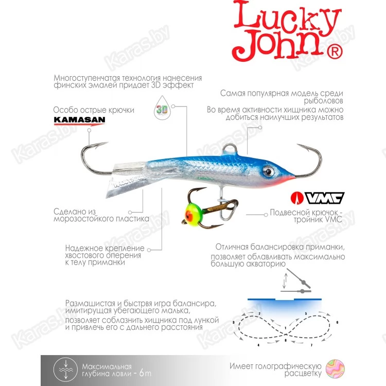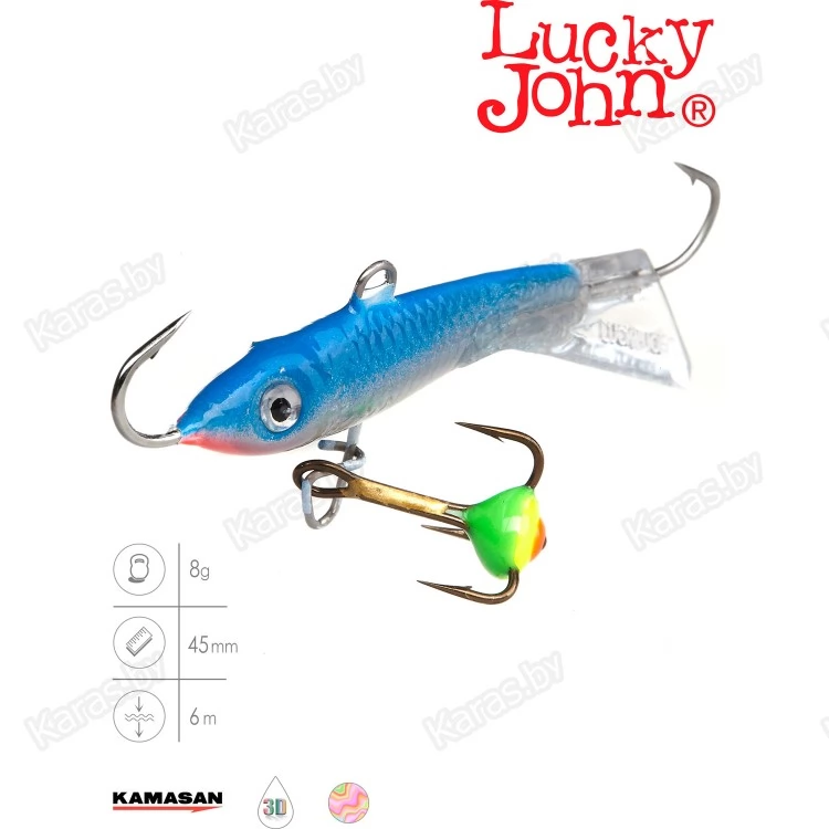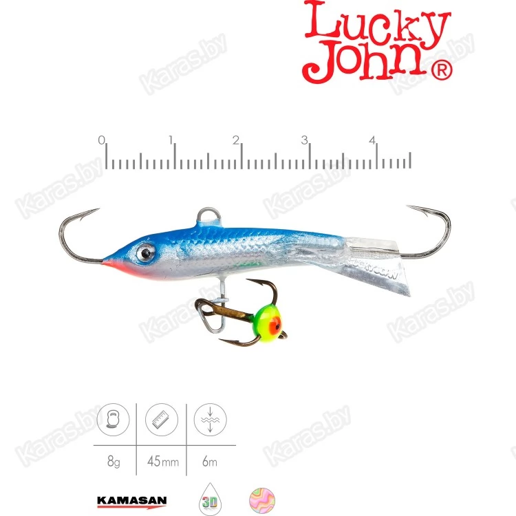 Промежуточная модель балансира между Lucky John 4 и 5, с сохранением всех пропорций. Предназначен для ловли окуня на глубинах до 6 метров, длиной 45 мм. Щука и судак, если в их поле зрения попадает эта приманка, не удержатся от поклевки. Игра приманки привлекает хищника со значительного расстояния, при условии, что ловят ею на монофильную леску от 0,14 до 0,18 мм или плетеный шнур 0,09 - 0,11 мм.