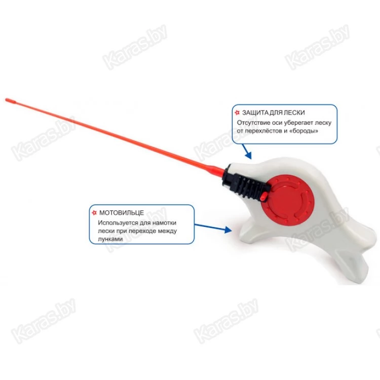 Корпус удочки из пенопласта. В отличии от "Безосевой балалайки", имеет ножки, которые являются и мотовильцем для подмотки лески при переходе с лунки на лунку.