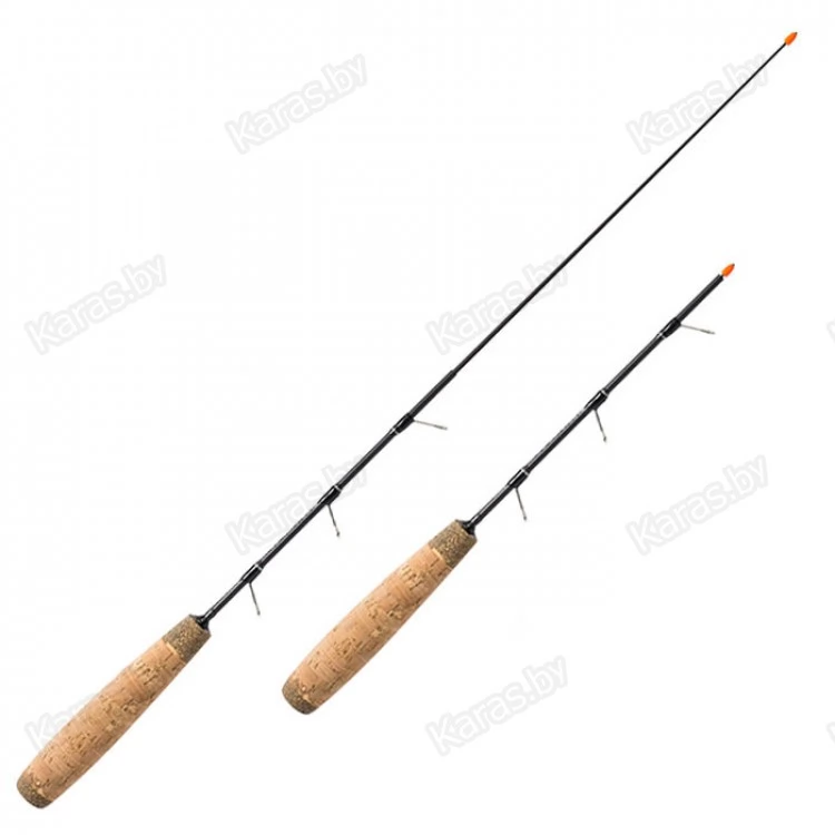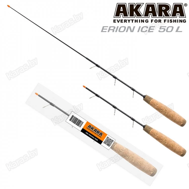 Удочка зимняя 2 колена Akara Erion Ice 50 L. Зимняя удочка для блеснения, отличительной особенностью, которой является отсутствие катушки, так как леска наматывается прямо на хлыст, на котором для этого сделаны специальные лапки. Это значительно упрощает конструкцию, благодаря чему, удочка получилась очень легкой. Для удобства транспортировки, хлыстик выполнен в телескопическом исполнении и состоит из двух колен. Удочка сделана в двух длинах 50 и 60 см и в двух вариантах жесткости. Для удобства крепления снасти, на кончике хлыстика установлен специальный силиконовый кембрик, яркого цвета.